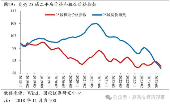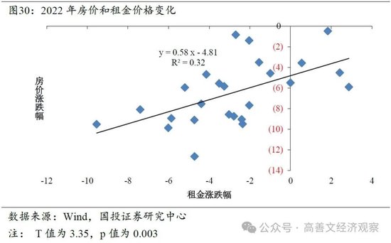 而统计数据显示,租金价格和房价是存在非常紧密的相关性,我们认为背后的逻辑在于两者都是新进入城市人口数量的代理指标。2023年相关数据统计结果和2022年基本一致,租金价格下降更大的城市房价跌幅更大。这在某种程度上解释了图30的现象,房价的下降反应了更多是城市人口基本面的变化,而并非是一个泡沫破灭后向基本面的回归过程。