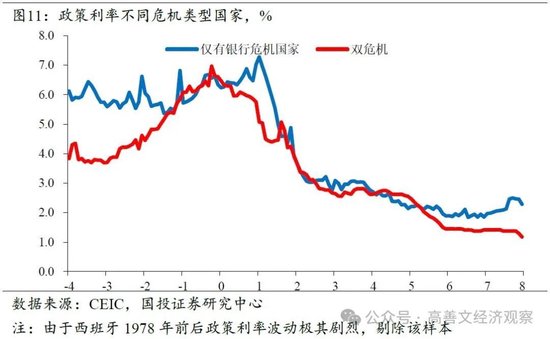 我们重点观察双危机国家和仅有银行危机国家的对比。如图7所示,如果将危机发生的年份定义为0,比较危机前后的经济增速,两类国家经济产出都遭受剧烈的损失,经济活动的修复时间也持续较长。[10]