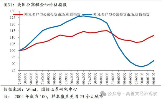在这个意义上,对比美国泡沫前后房价和租金指数,如下图31所示,进一步确认我们当下并未经历泡沫破灭所伴随的资产估值下沉。如果仿照中国的情况,将美国房价和租金指数变化的起点设在房价触顶前两年至三年。