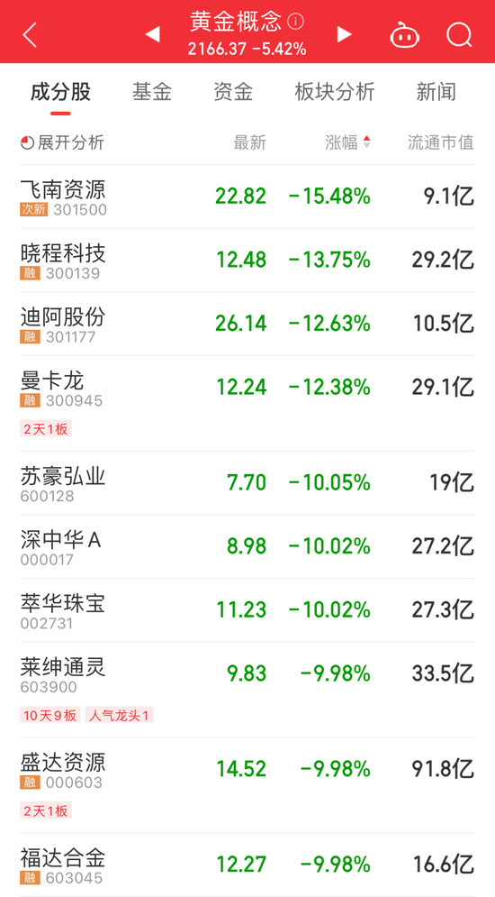 黄金股集体走低,黄金珠宝指数盘中跌超7%,有色金属板块整体不振,北方铜业、盛达资源等多股盘中一度跌停,前期走出9连板的莱绅通灵一字跌停。北方铜业低开低走,对于近几日股价的下跌,北方铜业相关工作人士表示,公司基本面一直没有什么变化,正常生产经营;前期股价可能涨得比较多,最近也有一些回调。