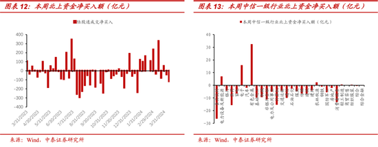 北上资金:本周陆股通北上资金净流出114.68亿元,其中沪股通净流出67.44亿元,深股通净流出47.24亿元。本周净流入行业前五名是有色金属、电子、电力设备及新能源、农林牧渔、轻工制造;净流出行业前五名是食品饮料、医药、计算机、消费者服务、非银行金融。