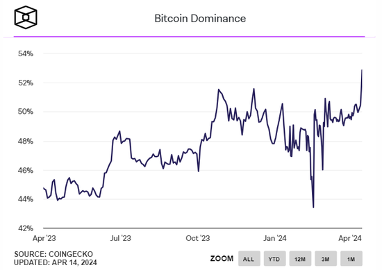 根据 The Block 的数据仪表板,在复苏之后,比特币现在占据了加密货币市场近 53% 的份额,这是自 2021 年 4 月上旬以来的最高水平,超过了所有其他加密货币的总和。