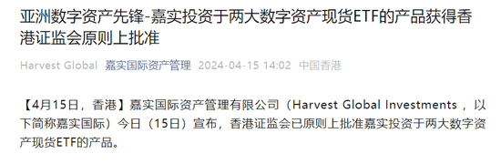 嘉实国际紧随其后宣布,香港证监会已原则上批准嘉实投资于两大数字资产现货ETF的产品。
