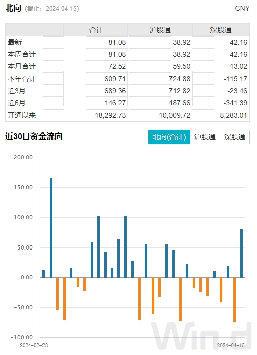 4月15日,北向资金大幅净买入81.08亿元,创3月下旬以来单日净买入新高。