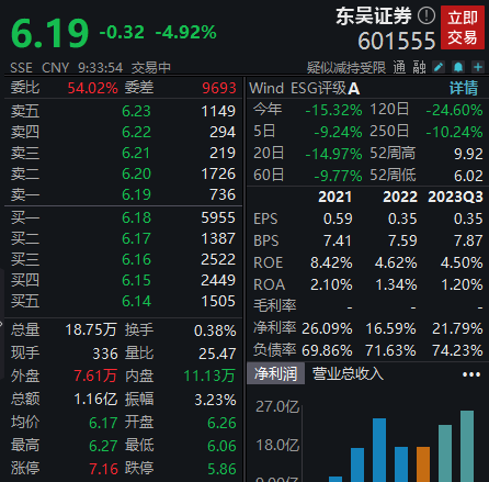 4月17日,东吴证券低开,截至发稿,该股跌近5%,报6.19元。