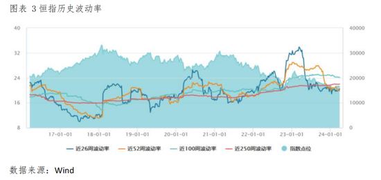波动率方面,恒生指数3月份波动率较今年年初,出现一定回升。截至2024年3月31日,恒生指数近26周波动率为20.47%;近52周波动率为19.87%;近100周波动率为24.17%;近250周波动率为21.98%。