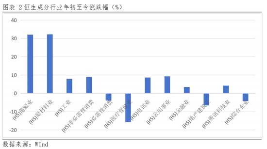 行业方面,恒生12大行业今年以来多数上涨,其中,能源业上涨32.06%、原材料业上涨32.22%、非必需性消费上涨9.02%,领涨大盘。医疗保健、地产建筑业、必需性消费以及综和企业则领跌。