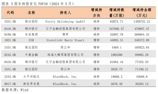 股东持股变化方面,锦州银行(0416.HK)、ESR(1821.HK)、中薇金融(0245.HK)等被大幅增持;维达国际(3331.HK)、东岳集团(0189.HK)、太平洋航运(2343.HK)等被大幅减持。