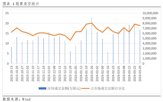 股票卖空数据方面,2024年3月,区间卖空成交额30,673,915.89万港元,占市场成交总额的百分比17.68%,表明市场持续做空较前一个月有所回升。