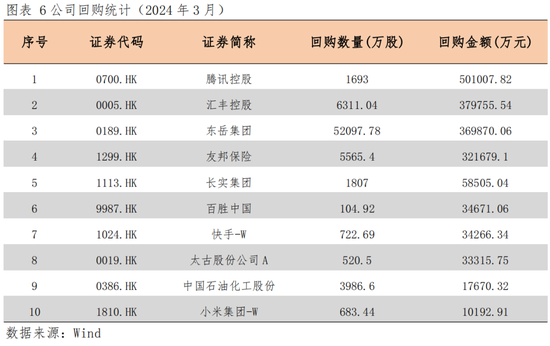 2024年3月,市场回购家数与金额有所减少。区间总回购家数65家,总回购金额37.98亿港元。其中,腾讯控股(0700.HK)、汇丰控股(0005.HK)、东岳集团(0189.HK)回购金额位于榜单前列。
