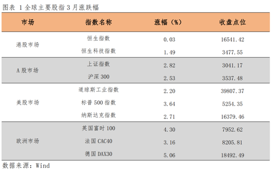 2024年3月,海外市场方面,美股市场三大指数延续上行走势,走势一度刷新历史高点。其中,标普500指数上涨3.64%,纳斯达克指数上涨2.71%,道琼斯工业指数上涨2.20%。伦敦金融时报100、法国CAC40、德国DAX30指数均录得不同程度上涨。