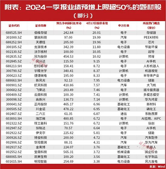 下面不再一一列举,我们也特意筛选了近日发布今年一季度业绩预增公告、4月17日股价相对强势且有相关热门题材的个股标的供大家参考,具体名单可见(附表)。