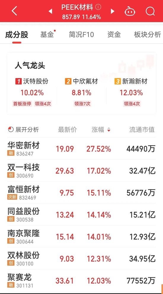 PEEK材料概念表现最火爆,收盘涨幅超过11%。华密新材大涨27.52%,肇民科技收获20cm的涨停板,双一科技、富恒新材、同益股份、聚赛龙、新瀚新材、风光股份涨超10%。