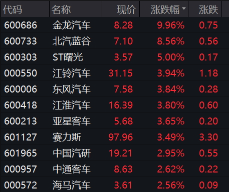 此外,汽车整车及汽车零部件板块表现活跃,金龙汽车涨停,北汽蓝谷、亚星客车、江淮汽车等跟涨。