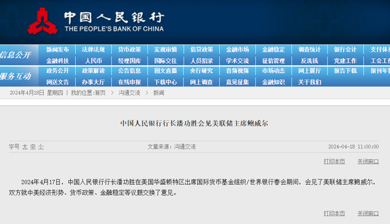据中国人民银行官网,2024年4月17日,中国人民银行行长潘功胜在美国华盛顿特区出席国际货币基金组织/世界银行春会期间,会见了美联储主席鲍威尔,双方就中美经济形势、货币政策、金融稳定等议题交换了意见。