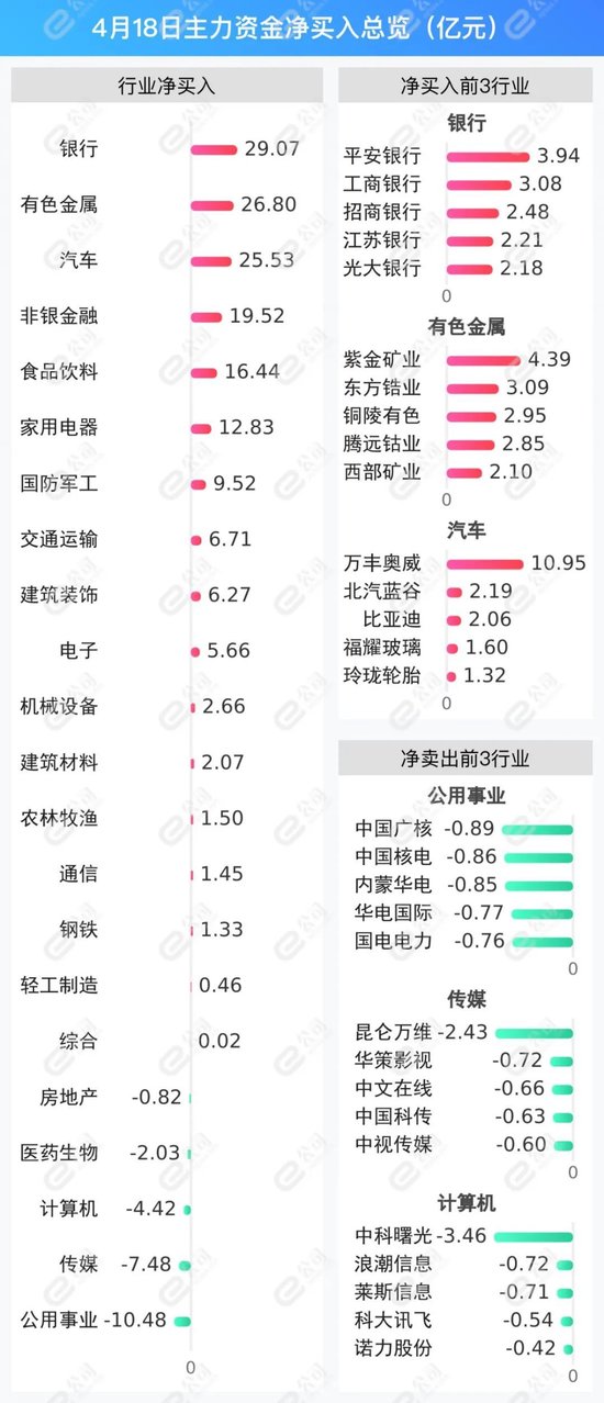从行业层面看,银行、有色金属、汽车获主力资金净买入金额居前,分别为29.07亿元、26.8亿元、25.53亿元。