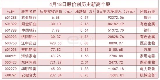 截至4月18日最新收盘,两市共有10只个股股价创历史新高。其中农业银行、紫金矿业、中国银行等5日主力资金净流入较为明显。