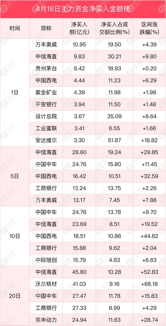 从买卖金额来看,万丰奥威、中信海直、贵州茅台获主力资金净买入金额居前,分别为10.95亿元、9.83亿元、8.42亿元,占当日成交额19.5%、30.21%、18.93%。