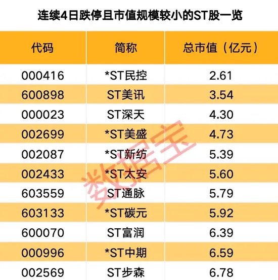 截至今日收盘,*ST民控(维权)、ST美讯(维权)、ST深天(维权)、*ST美盛(维权)4家公司的市值不足5亿元,若没有提前触及其他退市风险,新规发布6个月后连续20个交易日市值均低于5亿元,则存在被强制退市风险。