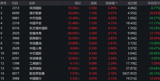 消费股和金融股涨幅居前。申洲国际涨5.09%,海尔智家涨4.31%,中升控股涨4.20%,领涨蓝筹。