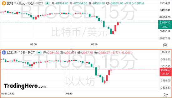 周五,由于中东局势恶化打压了风险情绪,比特币一度失守60000美元/枚,日内跌超5%。以太坊一度跌破2900美元/枚。