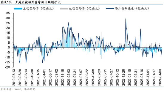 近期美股走势的掣肘点或在于财报季及再通胀的博弈,叠加地缘局势升温,外围不确定性或进一步增强。本周美股将迎来Q1财报披露高峰,据Factset预测,标普500一季度EPS同比增速或为3.2%,其中科技股仍为核心驱动力(21%),财报表现有望支撑近期美股走势。然而,再通胀及地缘政治或与财报效应形成“对抗”:①近期多项数据催生再通胀隐忧,叠加联储重要官员言论偏鹰,海外货币政策预期仍在下挫;②地缘冲突推动全球避险情绪升温,上周美元/美债利率冲高,主、被动外资净流出规模分别创今年2月、去年10月以来单周新高(-3.64/-3.55亿美元),资金面或阶段性承压。