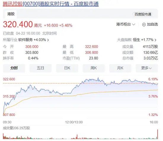 值得注意的是,腾讯控股今日大幅走高,盘中涨超6%创年内新高,收盘涨5.46%报320.4港元,市值重返3万亿港元上方。