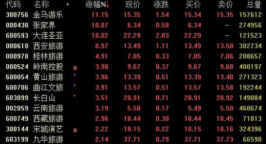 旅游出行板块再度活跃,截至收盘,金马游乐涨超11%,张家界、大连圣亚涨停,西安旅游涨约9%,西安饮食、华天酒店涨约6%。