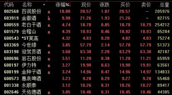 酒类股盘中发力走高,截至收盘,百润股份、金徽酒涨停,老白干酒涨近5%,今世缘、迎驾贡酒等涨超3%。