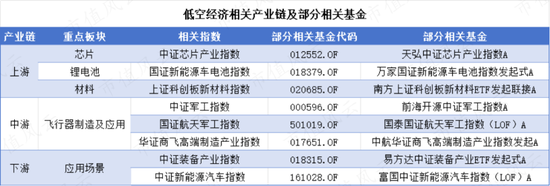 低空经济产业链下游主要为应用场景,包括低空物流、低空农业、飞行服务等,可以关注高端制造以及新能源汽车相关主题基金。