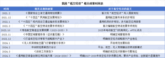 2021年低空经济首次被写入国家级规划,随后便开始完善相关配套设施,比如2022年1月《“十四五”现代综合交通运输体系发展规划》和2023年11月发布的《中国空域管理条例(征求意见稿)》开始规划低空经济的通用机场和通用空域。