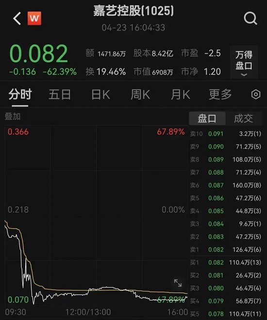港股方面,23日,主要从事成衣产品制造及贸易业务的港股公司嘉艺控股盘中闪崩,一度跌近 70%,收盘跌 62%,市值仅剩 6900 万港元。
