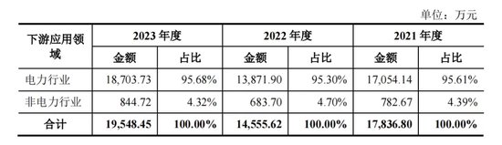 对于珠海鸿瑞来说,来自电力行业的收入构成了公司营收的主要来源,2021年-2023年,电力行业为公司贡献的收入分别为1.71亿元、1.39亿元和1.87亿元,占比分别为95.61%、95.30%和95.68%。