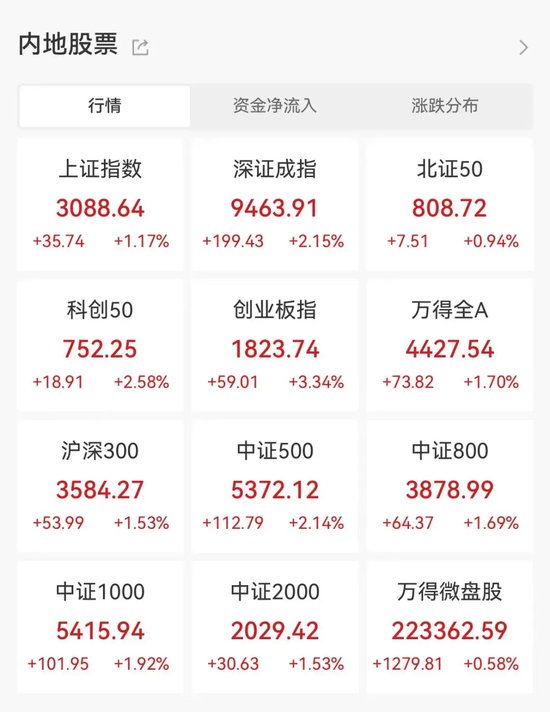 今日,A股三大指数放量反弹。截至收盘,沪指涨1.17%,深证成指涨2.15%;创业板指涨幅最高,达3.34%。