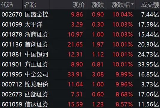 4月26日,券商板块高开高走。申万证券Ⅱ指数午后快速拉升,收盘大涨6.04%,全天成交512亿元。成份股掀起涨停潮,其中国盛金控竞价阶段涨停,太平洋、浙商证券、首创证券、中国银河、方正证券、中金公司、锦龙股份等券商股均于午后或尾盘封板涨停。