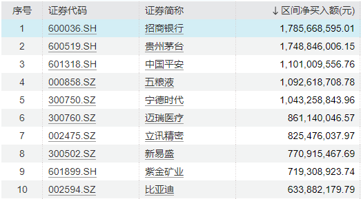 整周来看,招商银行和贵州茅台净买入额分别为17.86亿元和17.49亿元,中国平安、五粮液和宁德时代加仓额均超10亿元。