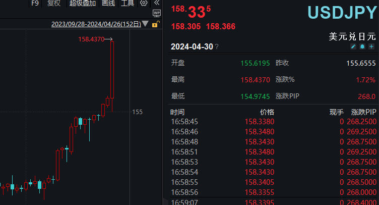 随后,美元兑日元连续跌破156、157和158的整数关口,最高冲到了约158.43兑换1美元,创下1990年5月以来约34年的新低。