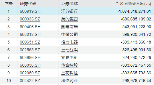 卖出一侧,江苏银行累计净卖出额为10.74亿元,美的集团和国电南瑞减仓额均超5亿元。