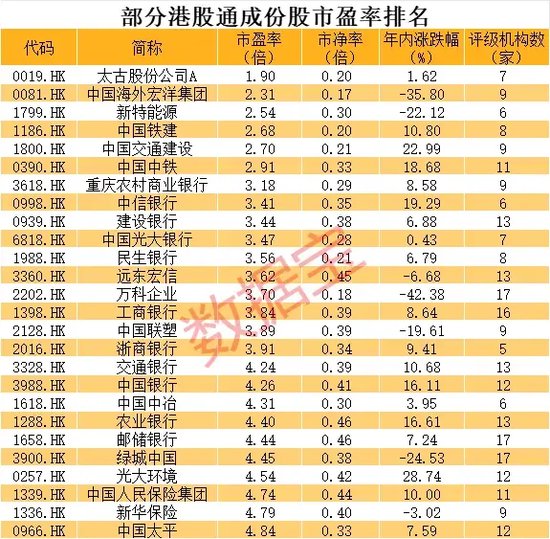 关注度较高的低估值股票,有望成为南下资金的新猎物。据数据宝统计,市盈率低于5倍、市净率低于0.5倍且评级机构数在5家及以上的港股通股票,合计有26只。从市净率角度看,中国海外宏洋集团、万科企业、中国铁建、太古股份公司A、中国交通建设等个股不足0.3倍。市盈率方面,太古股份公司A、中国海外宏洋集团、新特能源、中国铁建、中国交通建设等个股不足3倍。