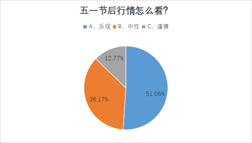 对于“五一”假期后的市场表现,私募排排网调查结果显示,51.06%的私募持乐观态度,认为一季报落地叠加政策面效果逐步显现,看好节后A股行情;36.17%的私募对节后行情持中性态度,认为市场可能会延续震荡;仅有12.77%的私募对“五一”后的市场表现持谨慎态度。