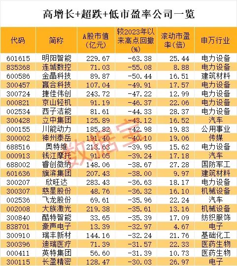 在上述业绩高增长的157家公司中,最新滚动市盈率低于30倍,且收盘价较2023年以来高点回撤30%以上的公司有24家。