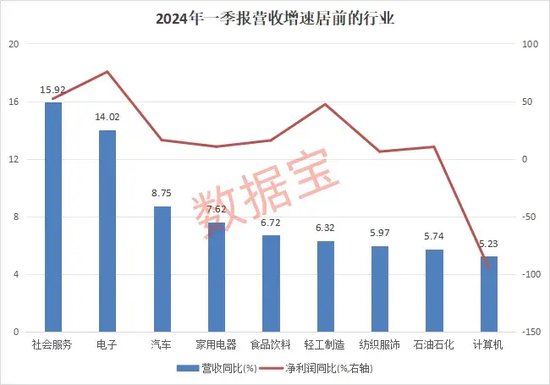 分行业来看,与大消费相关的行业一季度增长显著。9个行业一季度营收增速超5%,包括社会服务、电子、汽车、家用电器、食品饮料等,其中社会服务行业营收增速15.92%,排在第一位。与基建、新能源相关的领域一季度营收下滑明显,其中电力设备、煤炭、房地产、建筑材料营收降幅均超10%。