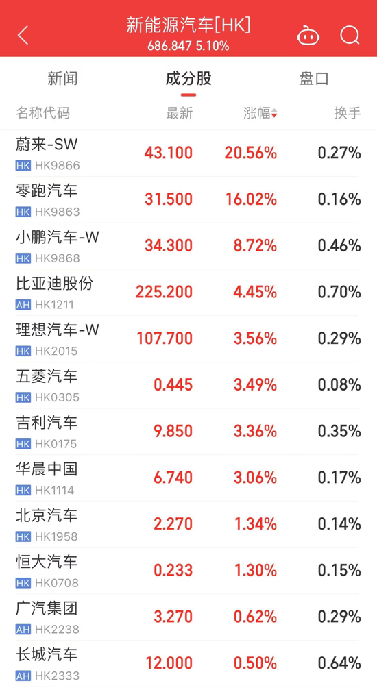 5月2日,港股开盘,汽车板块快速上涨。截至券商中国发稿,新能源汽车板块涨超5%,蔚来汽车大涨20.56%,零跑汽车涨16.02%,小鹏汽车涨8.72%。