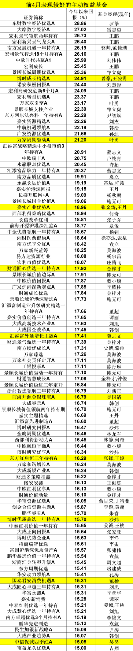 数据显示,截至4月30日,今年以来共有337只主动权益基金业绩超过10%,24只超过20%,而最牛基金业绩超过28%。
