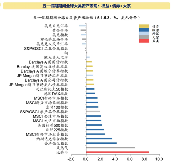 假期非农数据及联储5月FOMC使得市场降息预期再度出现变化,从会议纪要及会后鲍威尔的表态来看,一方面排除了加息的可能性,另一方面也承认通胀回落仍需时间。会议结束后,市场情绪出现提振,美股出现明显反弹。相较于此前不断推后的降息预期,市场对于联储超预期紧缩的担忧得到缓解。不仅如此,4月非农数据显示劳动力市场需求边际走弱,作为联储最为重要的政策指标之一,市场短期降息预期的交易有所升温。美元流动性的边际缓和有望持续为此前低配的新兴市场资产带来利好,假期受益于美元流动性的港股资产出现大涨,预计未来一段时间A股海外流动性冲击将得到明显缓和。