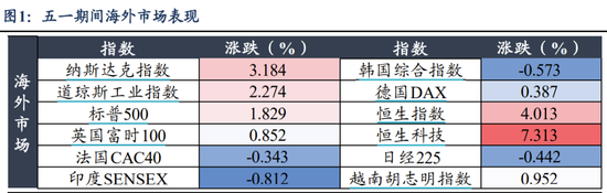 我国大陆五一假期期间,全球主要股票市场普遍上涨,与中国相关资产表现尤其突出,恒生指数、恒生科技指数5月累计涨幅分别为8%、5%,美元指数、美债收益率均有下行。从海外主要事件来看,美国4月新增非农就业数据低于预期,FOMC会议维持美国基准利率不变,投资者对年内美联储降息的预期再度升温。国内方面,市场面临的宏观环境相对友好,4月PMI数据继续处于荣枯线以上,同时4月底中央政治局会议定调偏积极,中央政治局会议后北京、上海、南京等城市已经进一步优化调整住房政策。五一期间国内服务消费数据表现较好,消费及出行数据较强。