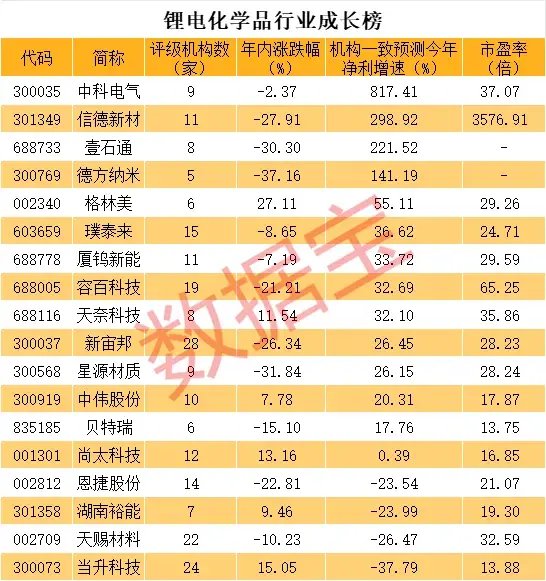 锂电材料细分领域或已开启盈利上升周期。根据机构一致预测,中科电气、信德新材、壹石通、德方纳米今年净利有望翻倍以上增长,格林美、璞泰来、厦钨新能、容百科技、天奈科技今年净利增长预计均超30%。