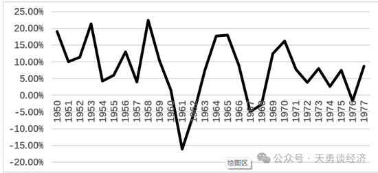 1950-1956年期间,中国平均GDP增长12.16%,1957-1977年平均DGP增长为4.63%。