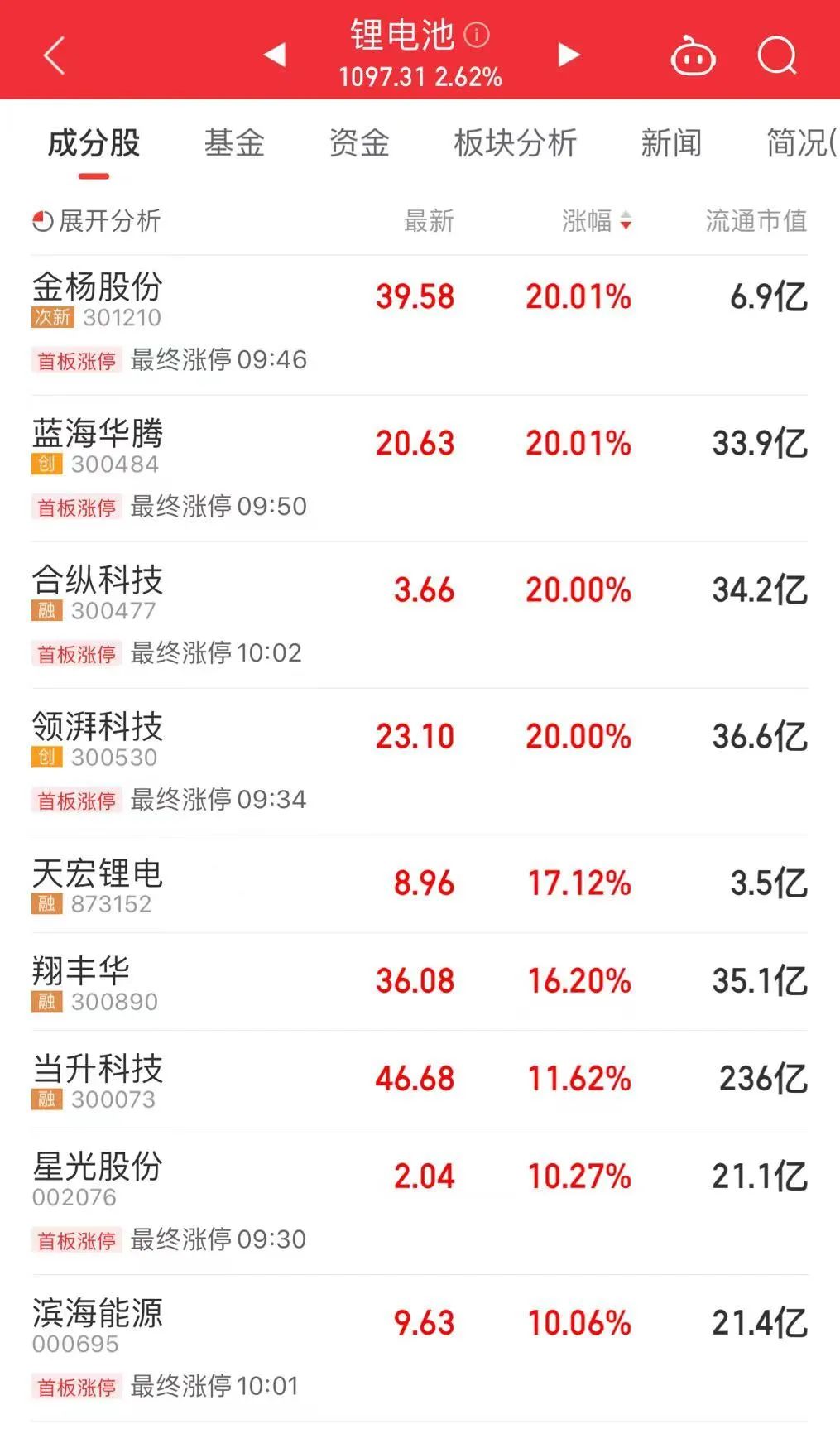 锂电产业链强势爆发。蓝海华腾、合纵科技(维权)、金杨股份“20CM”涨停。
