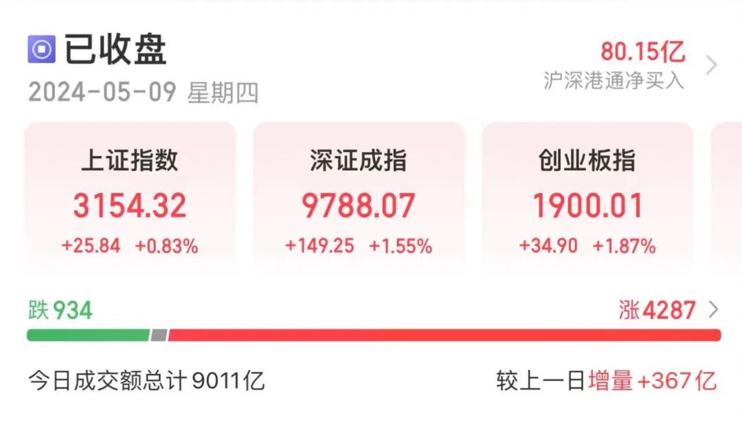 今日市场震荡反弹,沪指、深证成指均再创年内新高。截至收盘,上证指数上涨0.83%、深证成指上涨1.55%、创业板指上涨1.87%。A股全天成交9011亿元,北向资金净买入超80亿元。